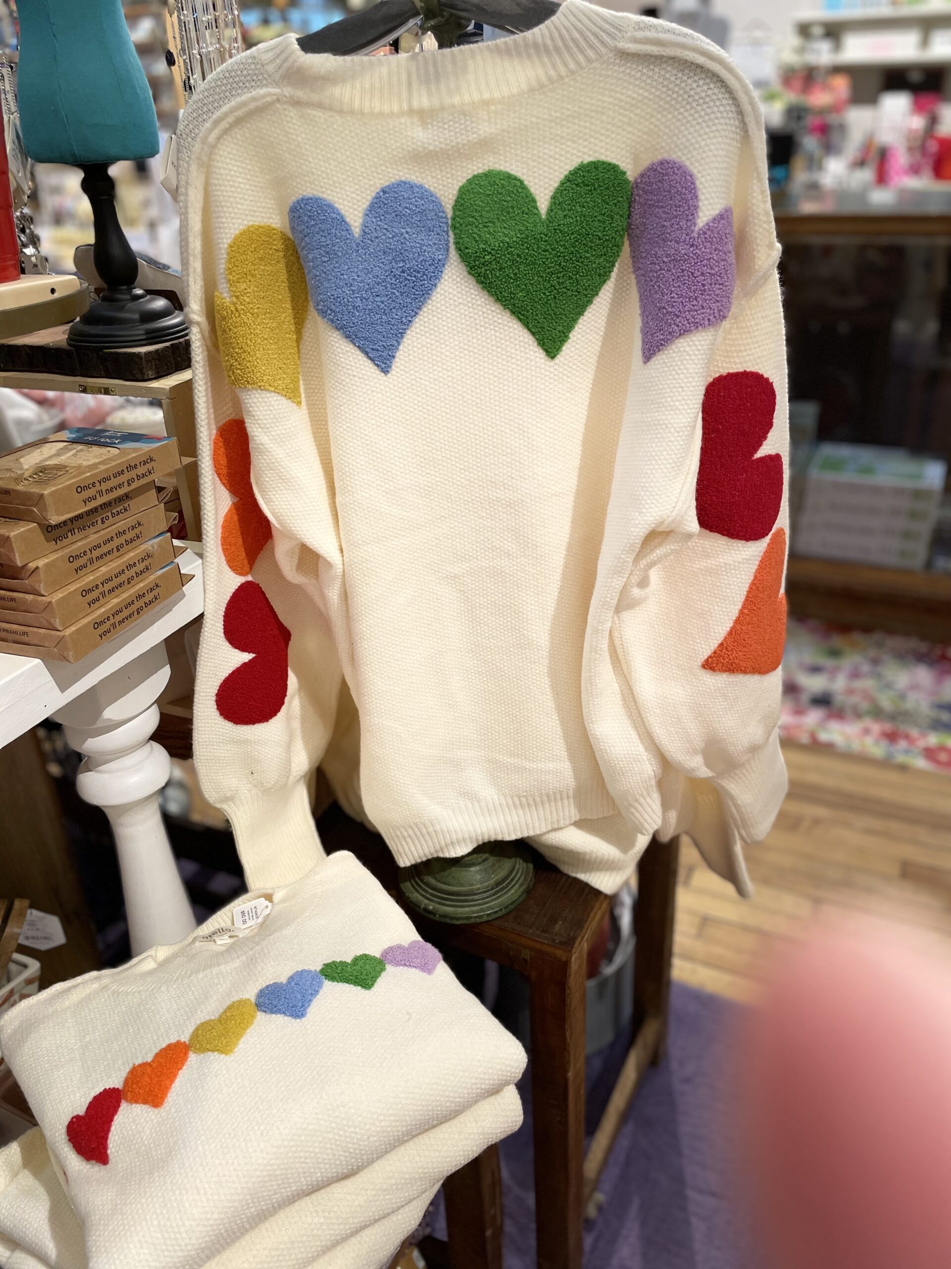 Mello Ivory Rainbow Heart Patch Relaxed Sweater is pure happy vibes—easy, cozy, and oh-so-cute. Easy fit with the balloon sleeve. Available in S,M, and L.
